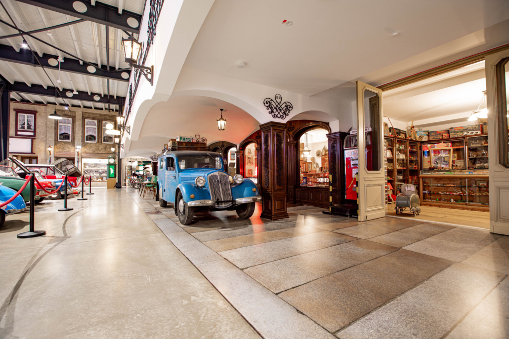 Wir begleiten Euch auf eine Zeitreise durch die Vergangenheit. Schlendert entlang unserer authentisch eingerichteten Geschäftsstraße mit den dazugehörigen Fahrzeugen der damaligen Zeit. Über 150 Autos und über 100 Motorräder ab den 30er Jahren aus deutscher und österreichischer Produktion geben ein breites Spektrum der mobilen Entwicklung bis hin zu den 80er Jahren.